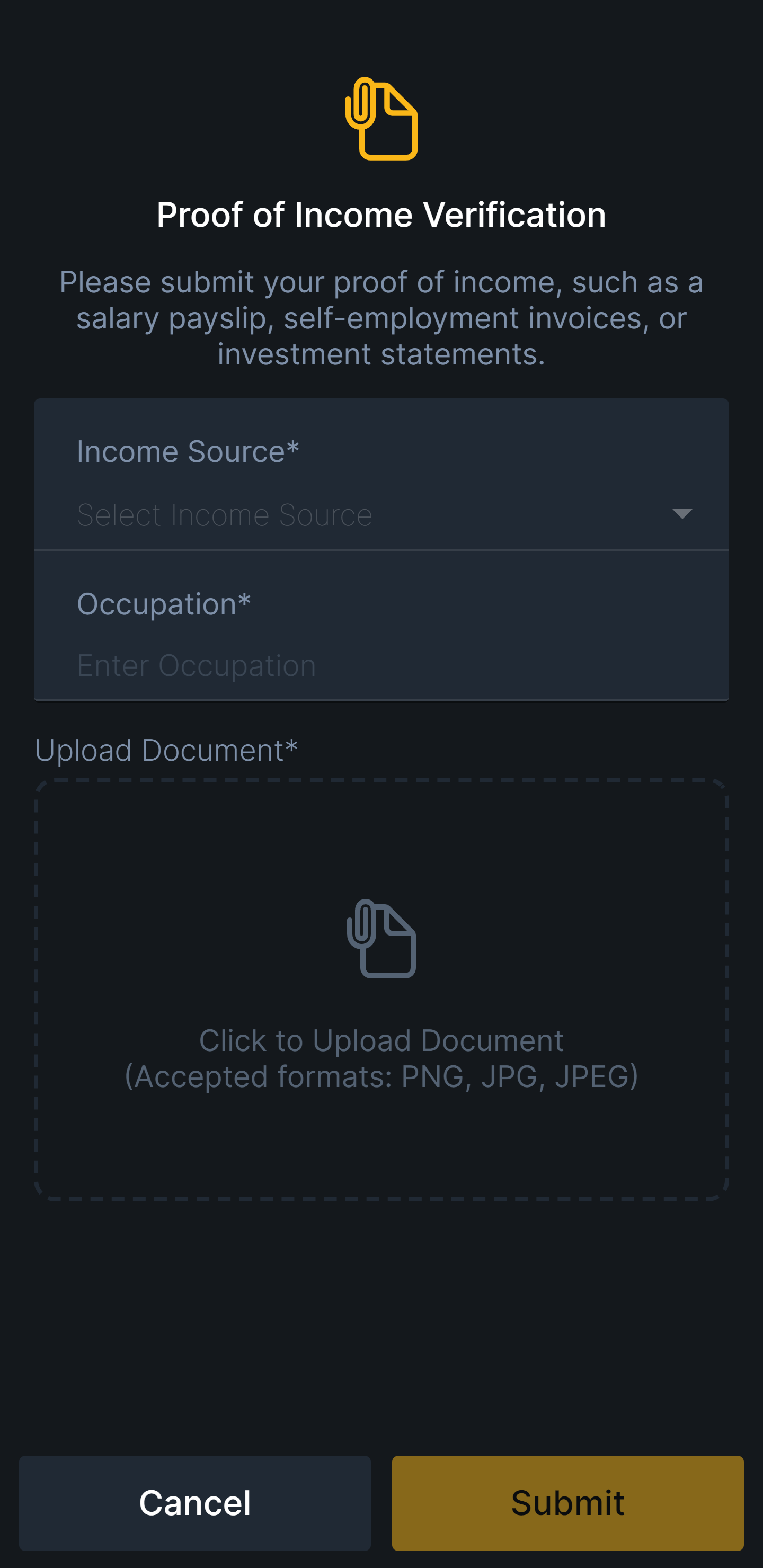 <figure><img src="https://3600526334-files.gitbook.io/~/files/v0/b/gitbook-x-prod.appspot.com/o/spaces%2F5X5qOJXBkAmpiBJb6AhJ%2Fuploads%2F6oC6SxmtBizeHWOmDZRD%2Fimage.png?alt=media&#x26;token=4fff88ec-1feb-4e7e-a93a-d09a570e1130" alt="" width="375"><figcaption><p>Submit Proof of Income</p></figcaption></figure>